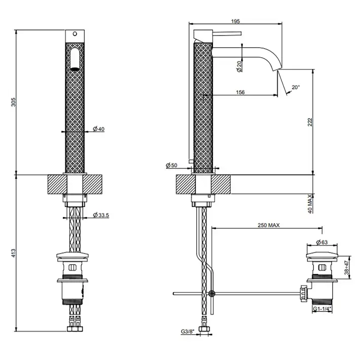 Gessi 316 Смеситель для раковины на 1 отв. с донным клапаном, h:305мм , излив: 156мм, цвет: brushed black metal pvd