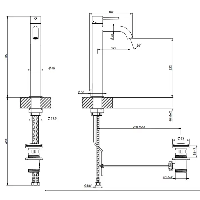 Gessi 316 Смеситель для раковины на 1 отв., высокий h:305мм, с донным клапаном, излив: 123мм, цвет: brushed black metal pvd