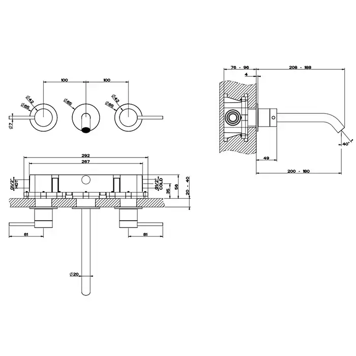 Gessi 316 Встраиваемый смеситель с изливом 200-180мм, внешняя часть, цвет: brushed black metal pvd