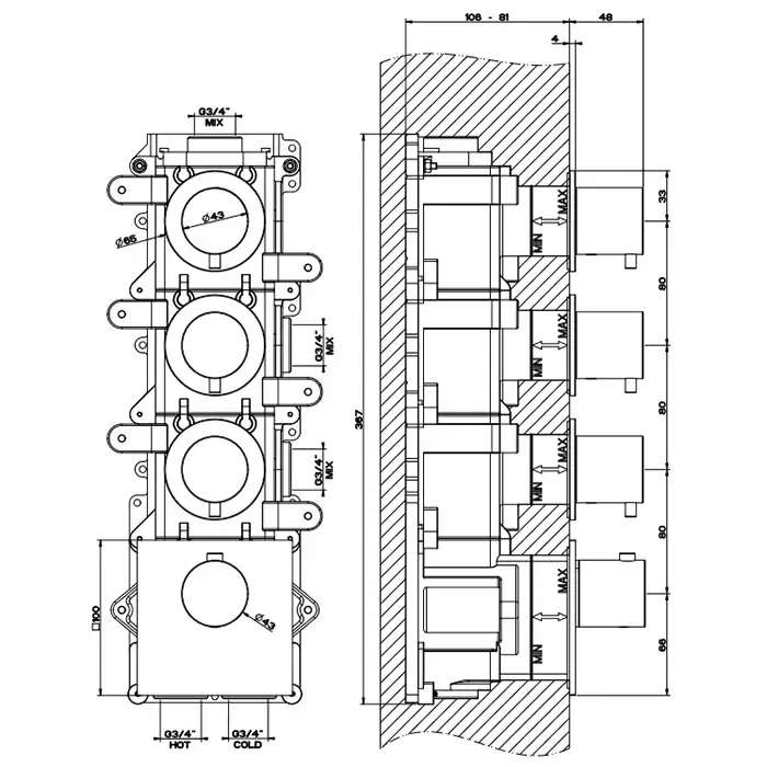 Gessi 316 Встраиваемый термостатический смеситель на 2 источника, резьба 3/4", внешняя часть, цвет: steel brushed