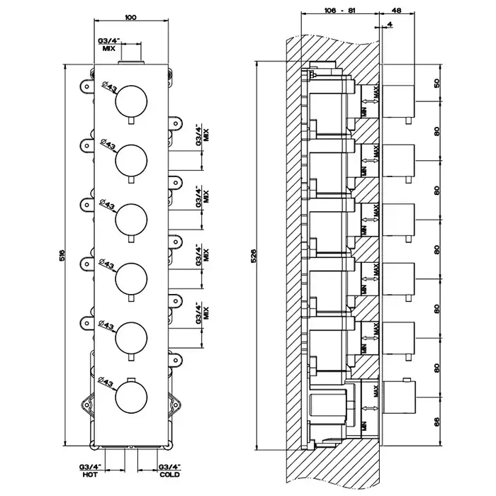 Gessi 316 Встраиваемый термостатический смеситель на 5 источников, резьба 3/4", внешняя часть, цвет: brushed black metal pvd