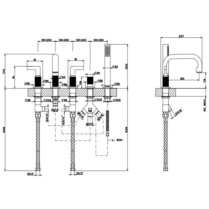 Gessi Inciso Смеситель для ванны, на 5 отв., с переключатель потоков, шланг 150см, и ручным душем, цвет: золото