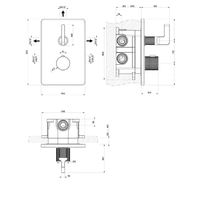 Gessi Inciso- Термостатический смеситель на 3 выхода, внешняя часть, Цвет: black XL
