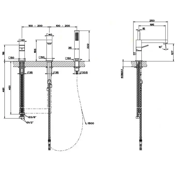 Gessi Rettangolo K Смеситель для ванны на 3 отверстия, с встроенным в излив переключателем и ручным душем, цвет: хром