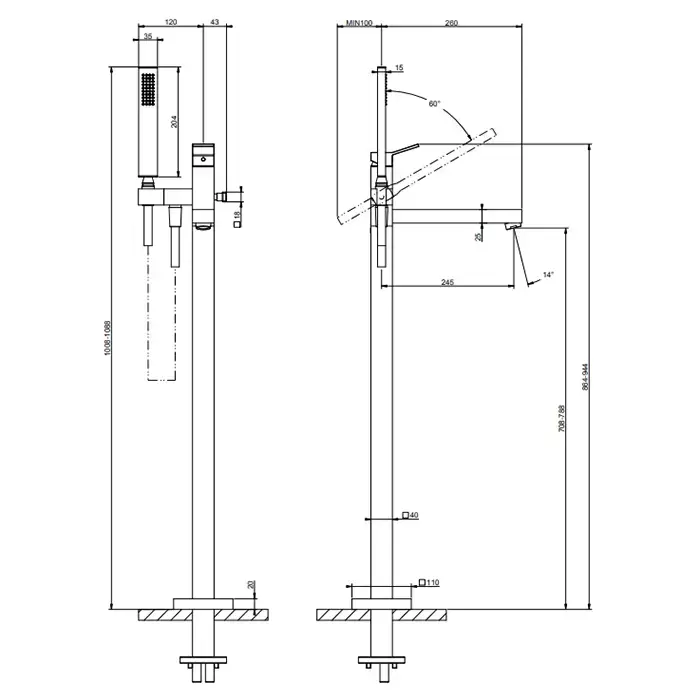 Gessi Rettangolo K Смеситель для ванны, напольный, с ручным душем, и шлангом 150см., внешняя часть, цвет: Black Metal Brushed PVD