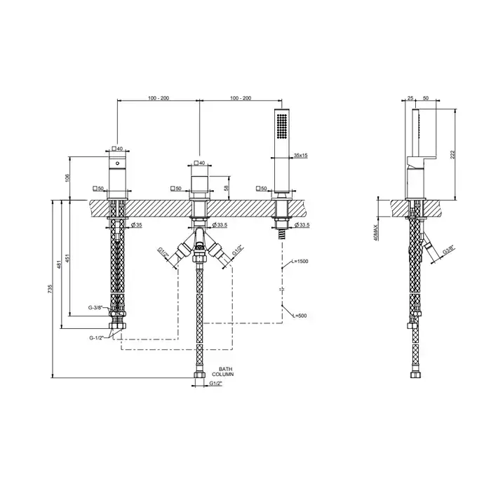 Gessi Rettangolo Смеситель для ванны на 3 отверстия, с переключателем и ручным душем, без излива, цвет: Black XL