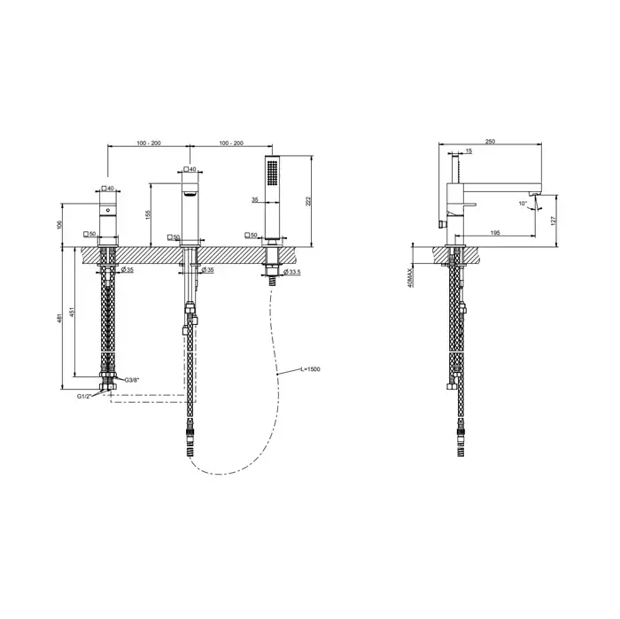 Gessi Rettangolo Смеситель для ванны на 3 отверстия, с переключателем, изливом 195мм и ручным душем, цвет: Black XL