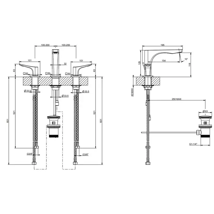 Gessi Rilievo Смеситель для раковины на 3 отв. с донным клапаном h=125мм, излив 154мм, цвет: хром