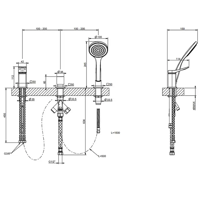 Gessi Rilievo Смеситель на борт ванны на 3 отв, с убирающаяся душевой лейкой, для наполнения через слив-перелив, цвет: black XL