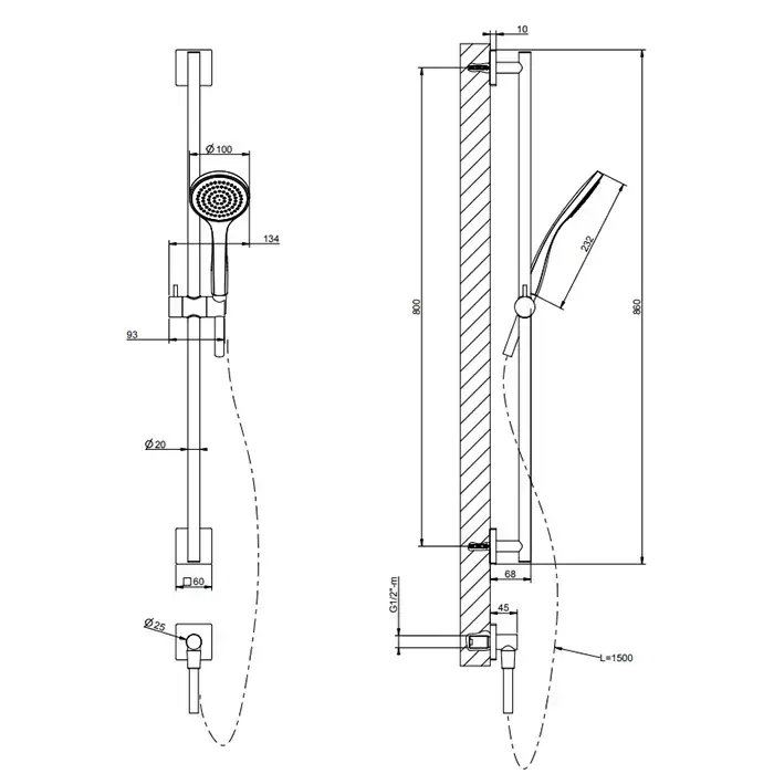 Gessi Rilievo Штанга в комплекте с душевой лейкой, шланг 1,50 м, вывод воды из стены, цвет: nero XL