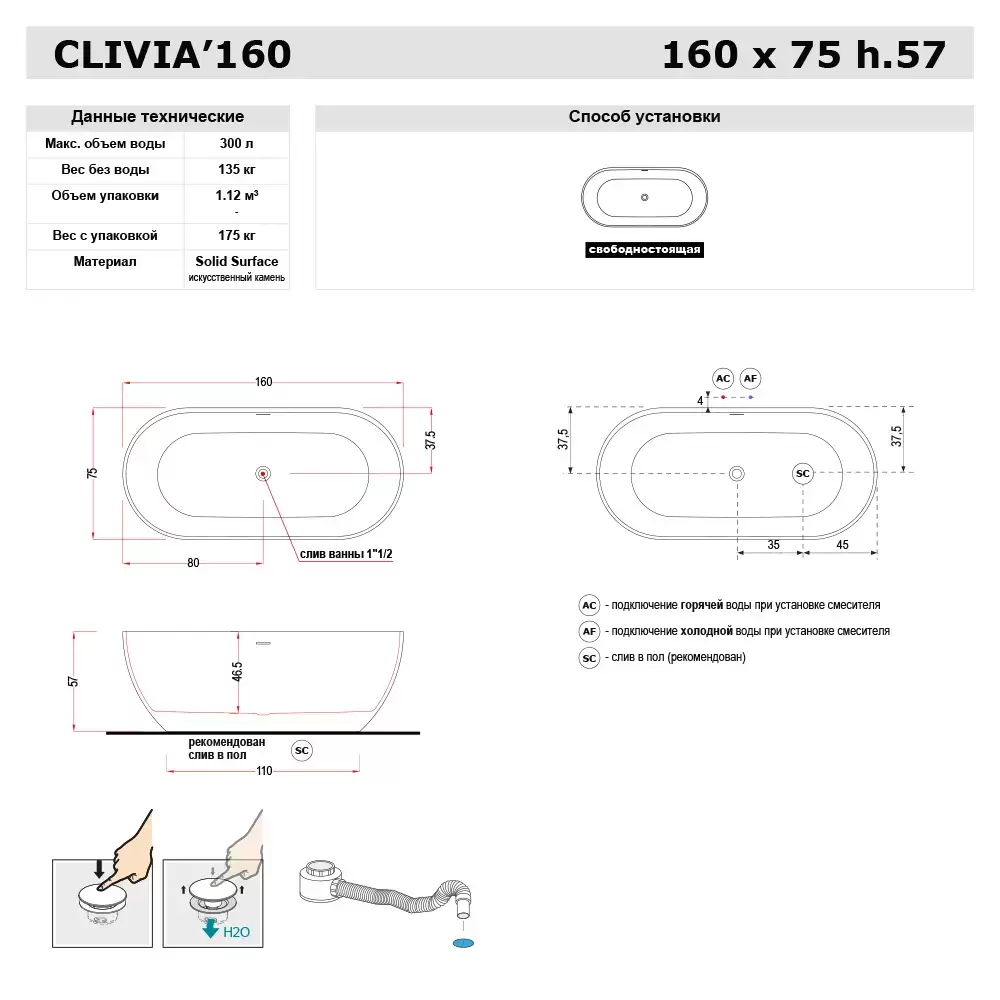 Gruppo Treesse Clivia Ванна 160х75х57 см, из композита, отдельностоящая, со щелевым переливом, цвет: белый глянцевый