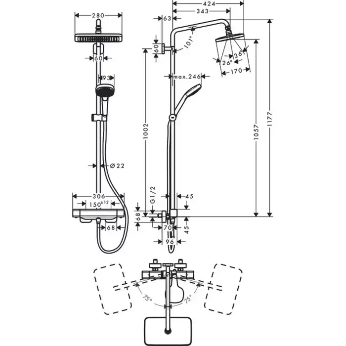 Hansgrohe Croma E 280 1jet Душевая система Showerpipe с термостатом для душа, цвет: хром