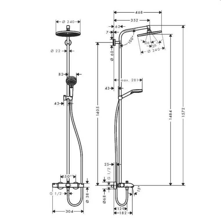Hansgrohe Crometta Showerpipe S 240 SHP: термостат для ванны + стойка с верхним душем 240мм + ручной душ со шлангом 160мм, цвет: хром