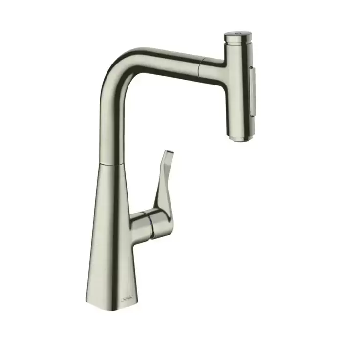 Hansgrohe Metris M71 Смеситель для кухни, на 1 отв, поворотный излив: 20.8см с вытяжным душем, 2jet, h238мм, sBox кнопка вкл/выкл,, цвет: нержавейка