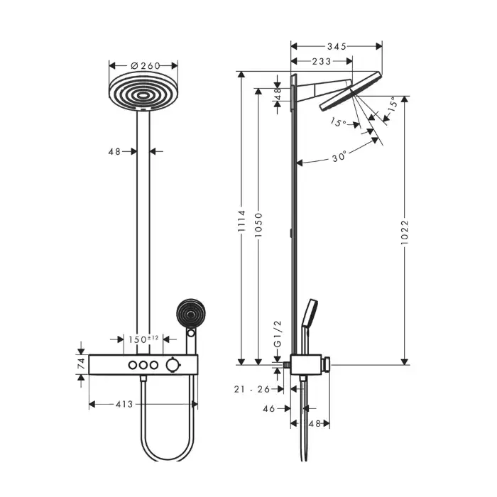 Hansgrohe Pulsify Душевая система с термостатическим смесителем, верхним душем Ø26см., ручным душем и шлангом, цвет: белый матовый