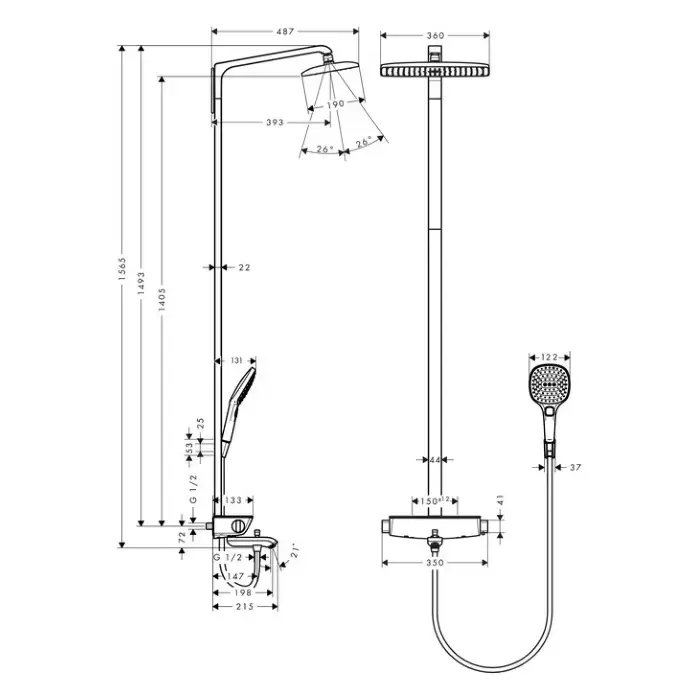 Hansgrohe Raindance Select Showerpipe 360 Душевой гарнитур, в набор входят: термостат с запорным и переключающим вентилем, переключатель для ручного душа, верхний душ Raindance E AIR 1jet 360x190 мм, ручной душ Raindance Select 150 3jet, душевой шланг