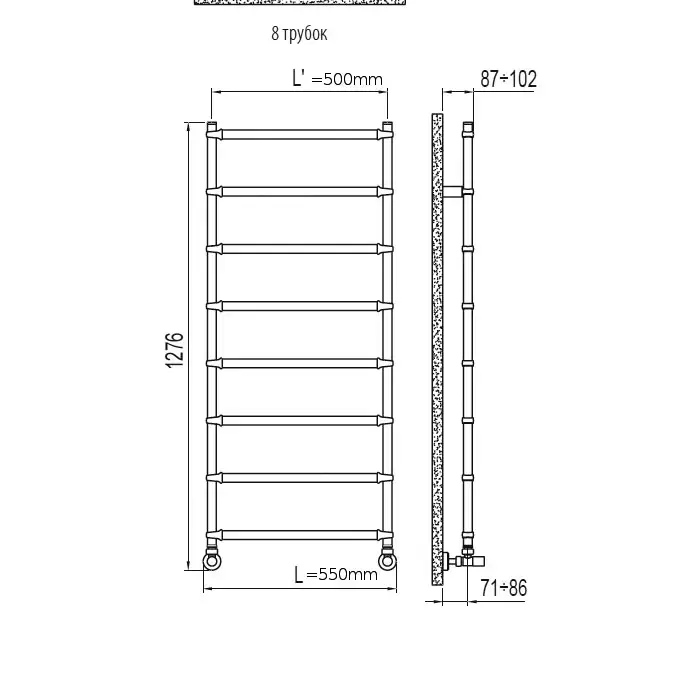 Irsap BELLA п/сушитель водяной для систем ГВС, 55хh127.6см, 8 трубок, (межосевое 50см), с вентилями и комплектом для монтажа KITCOPTUEC6450, цвет:хром
