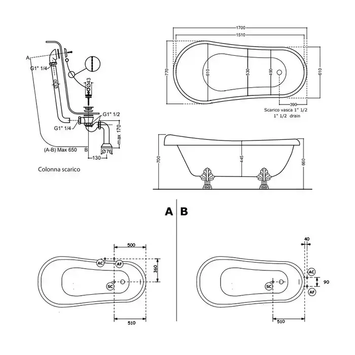 Kerasan Retro Ванна new отдельностоящая, 170х77см, глубина ванны 44,5см, цвет: белый, ножки хром