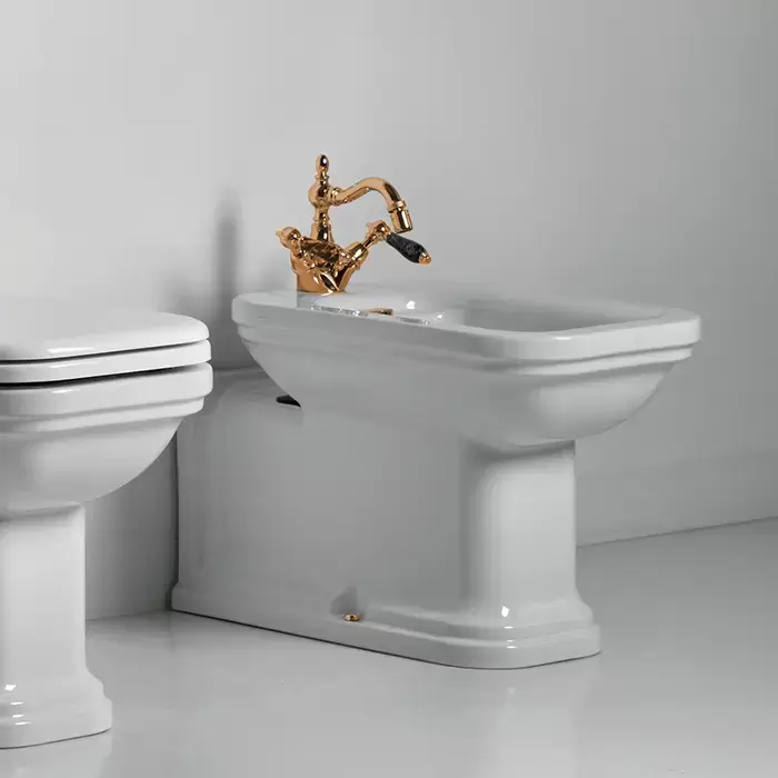 Kerasan Waldorf Биде напольное пристенное удлиненное "Prolongato" 65х37см с 1 отв. под смеситель, цвет: белый/золото