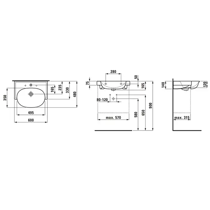 Laufen New Classic Раковина накладная 60х48х7.5см, с 3 отв., без перелива, цвет: белый матовый