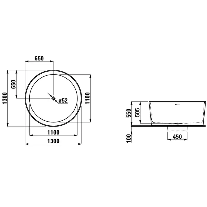 Laufen VAL Ванна 130x130x50.5см, отдельностоящая, круглая, с слив-переливом, материал: композит, цвет: белый