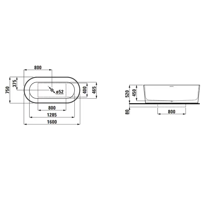 Laufen VAL Ванна 160x75x45см, отдельностоящая, с слив-переливом, материал: композит, цвет: белый