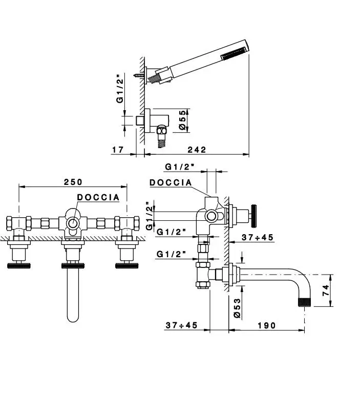 Nicolazzi Arena Смеситель для ванны с изливом из стены встраиваемый на 4 отверстия, излив: 190 мм, цвет: хром