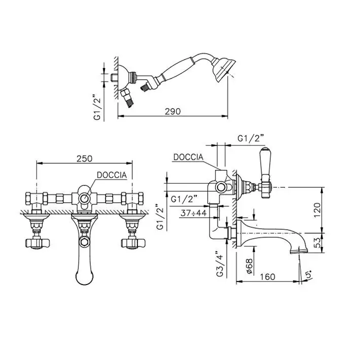 Nicolazzi Dames Anglaises Смеситель для ванны с 2мя ручками, встроенный, излив: 160мм, вкл. внутр часть + комплект руч. Душа, цвет: хром