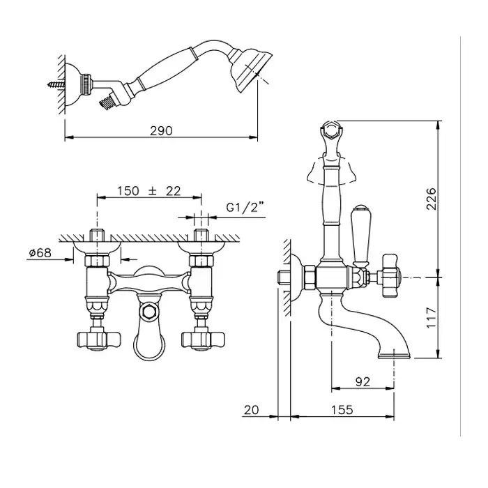Nicolazzi Dames Anglaises Смеситель настенный для ванны с 2мя ручками, с переключателем ванна/душ, + комплект руч. душа, цвет: бронза