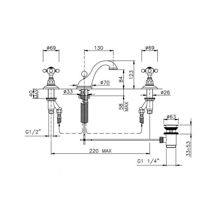 Nicolazzi Forest Смеситель для раковины с 2мя ручками, на 3 отв., с донным клапаном, излив 130мм, цвет: хром