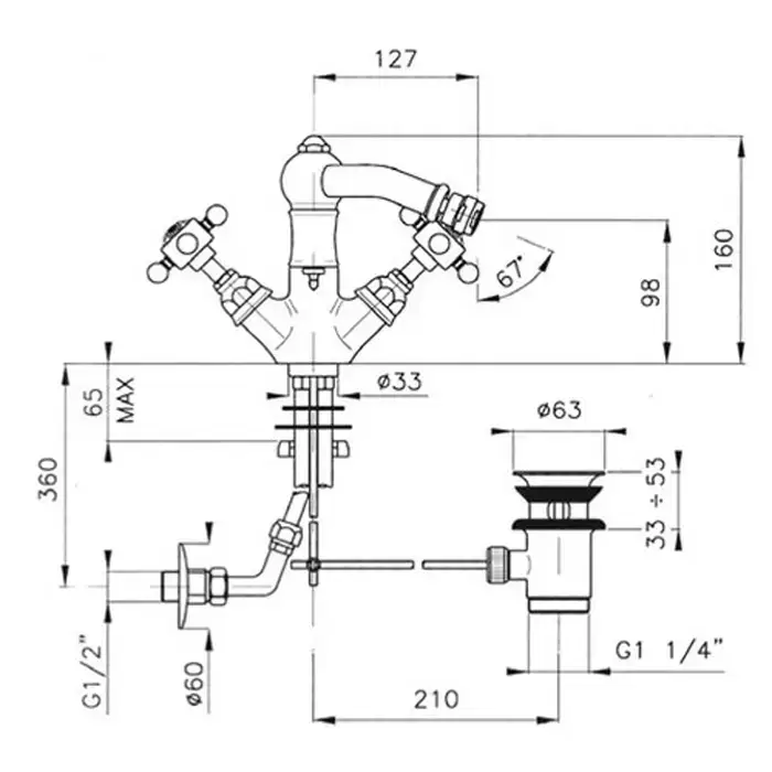Nicolazzi Half Dome Смеситель для биде с 2мя ручками, на 1 отв., с донным клапаном, излив 127мм, цвет: хром