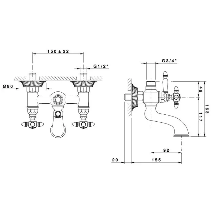 Nicolazzi Impero Смеситель для ванны настенный для душевой стойки на 2 отверстия, излив: 155 мм, цвет: хром