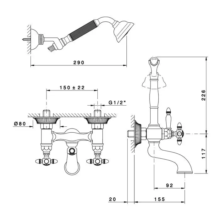 Nicolazzi Impero Смеситель для ванны с душем duplex на 2 отверстия, настенный, излив: 155 мм, цвет: хром