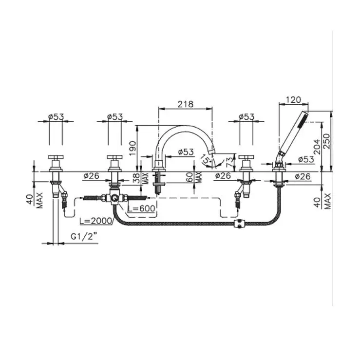 Nicolazzi M.Croce Смеситель на борт ванны на 5 отверстия, с ручным душем, излив: цвет: 218мм, хром