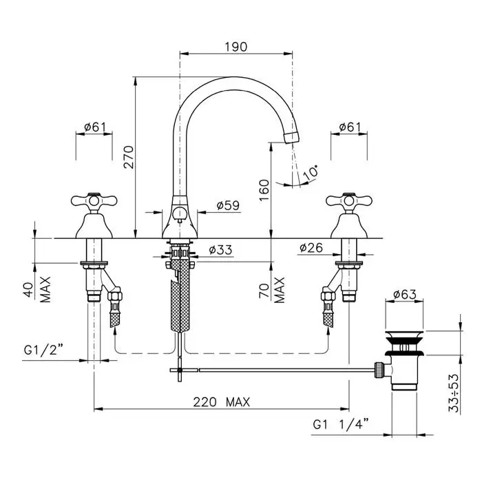 Nicolazzi Nuova Brenta Смеситель для раковины на 3 отверстия, с донным клапаном, высокий поворотный излив: 190мм, цвет: хром