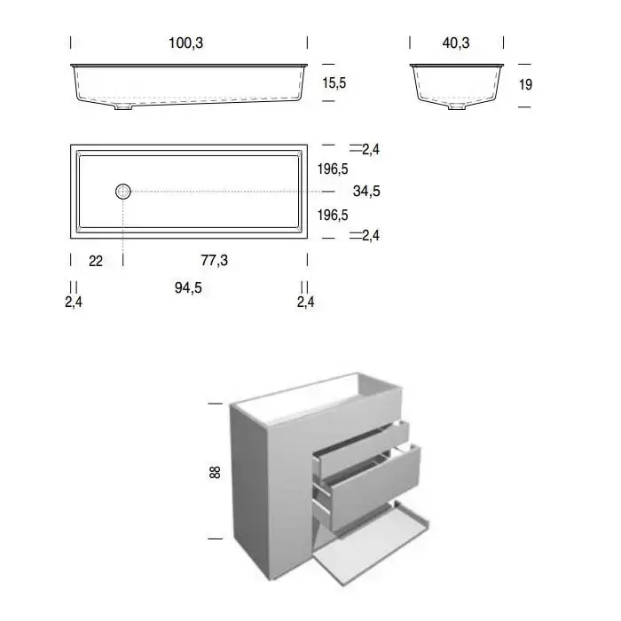 NOORTH milldue edition TOUCH Комплект мебели 100х40х88см, напольный, 3 ящика, слив в пол, раковина Milltek, смеситель H2O, цвет: Fango матовый