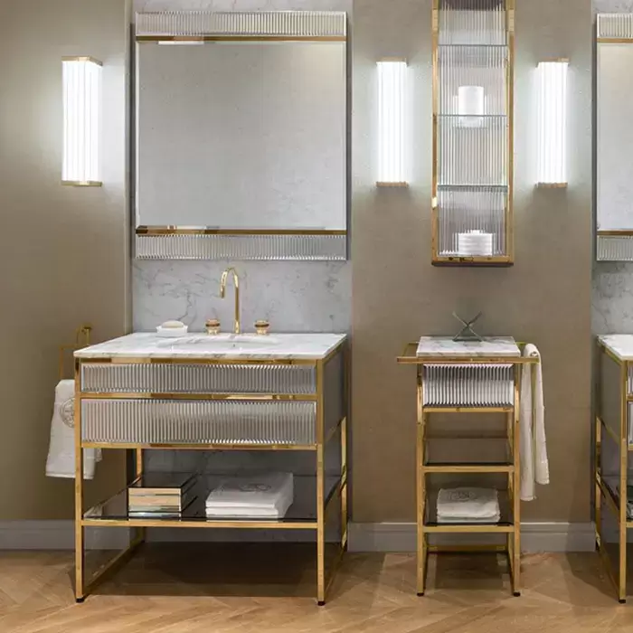 Oasis Academy Комплект мебели 66х53х84см., напольный, 1 ящик, 1 полка, столешница мраморная, с раковиной 54х43см., зеркало 66х100см., цвет: золото/Bianco Carrara
