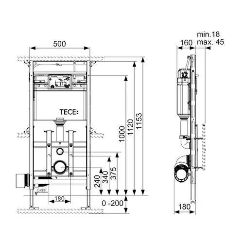 TECElux 200 Застенный модуль для установки подвесного унитаза, h=1120 мм, регулировка по высоте 8 см