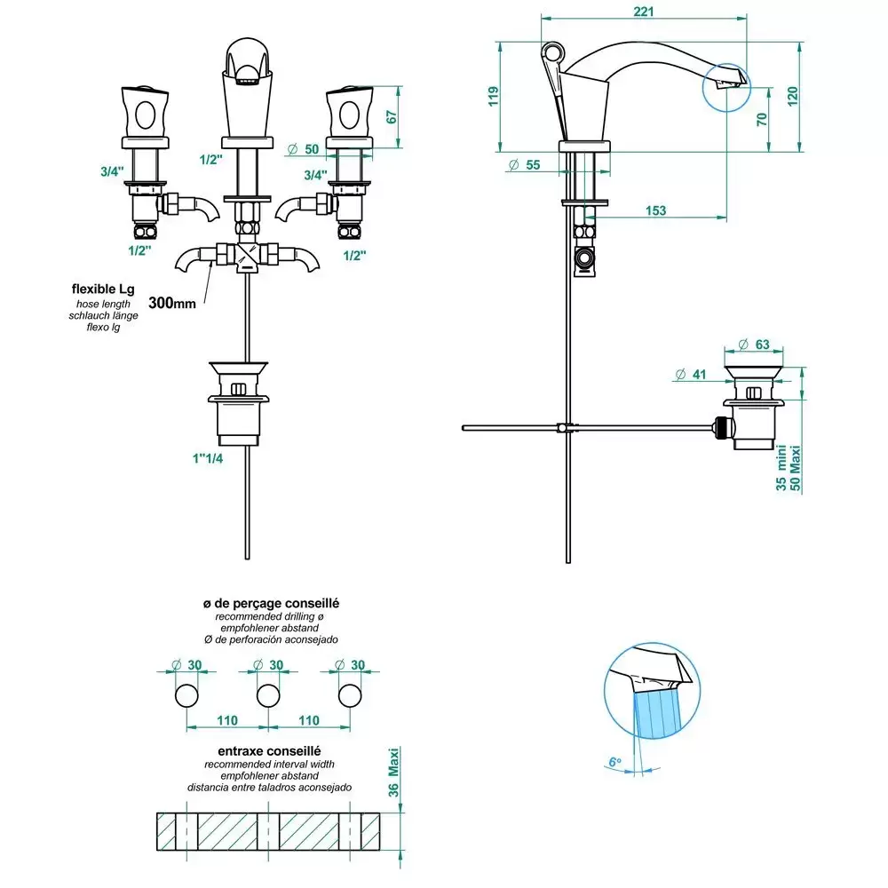 THG Bagatelle pierre noire Смеситель для раковины, 3 отв., цвет: хром
