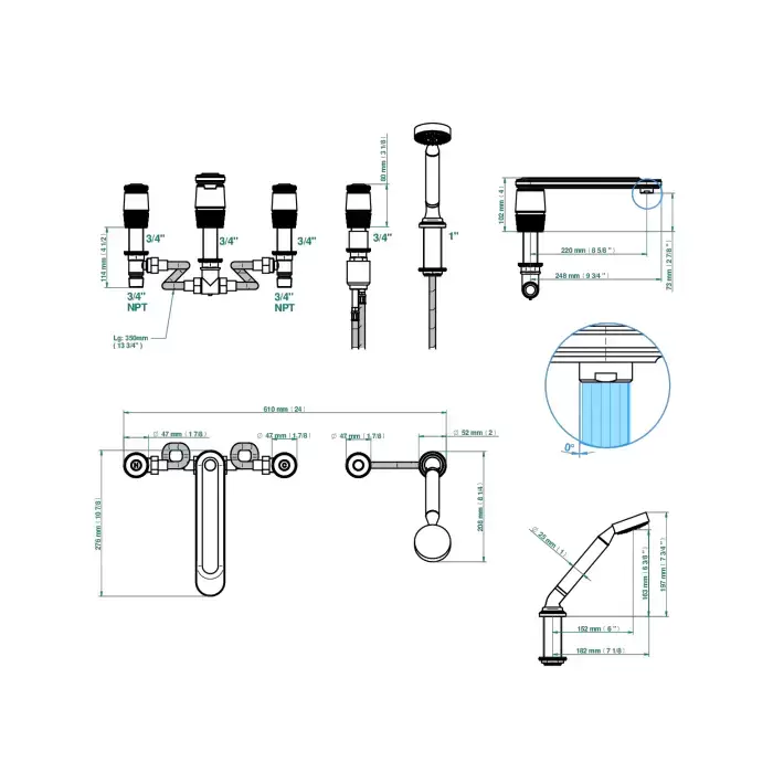 THG CORVAIR Смеситель на борт ванны на 5 отверстий, двойной, с ручным душем, цвет: полированное золото