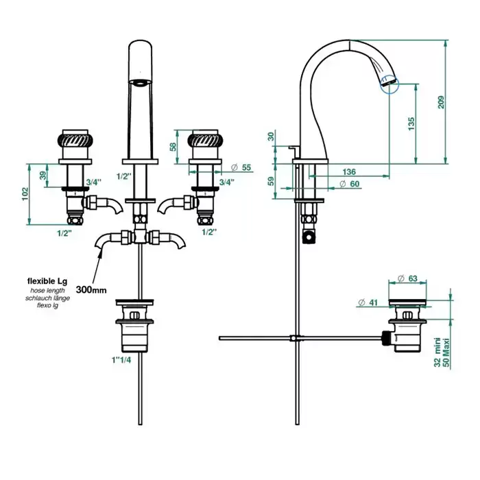 THG Diplomate Roped Rings Смеситель для раковины на 3 отверстия, с донным клапаном, цвет: хром/золото