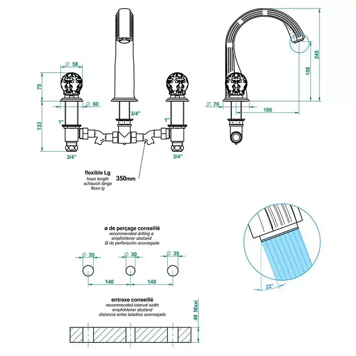 THG Flore Смеситель для ванны, 3 отв., цвет: хром/хрусталь