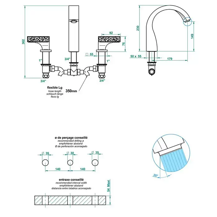 THG Ginkgo Смеситель для ванны, 3 отв., цвет: золото/хрусталь