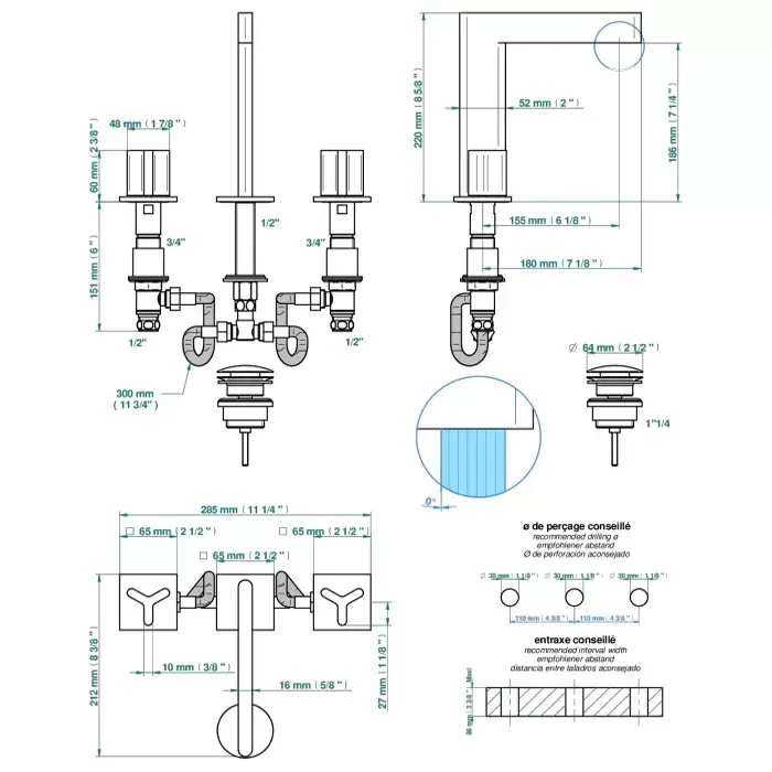 THG ICON-X METAL Смеситель для раковины, 3 отв., с донным клапаном, цвет: хром