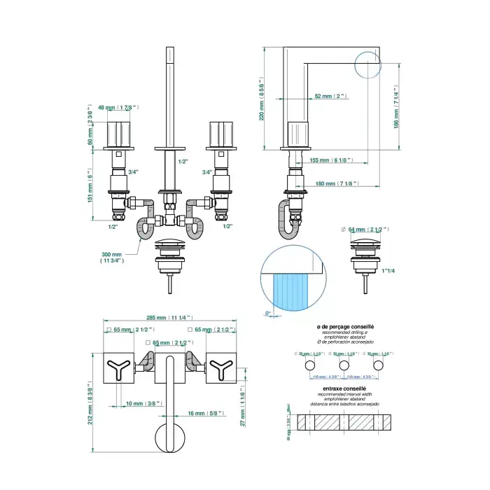 THG ICON-X TITANE Смеситель для раковины, 3 отв., с донным клапаном, цвет: полированное золото