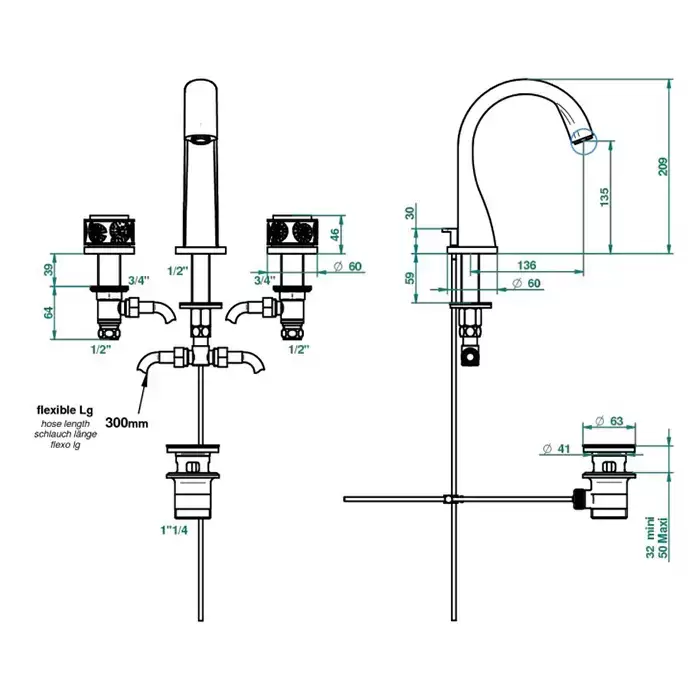 THG Island Смеситель для раковины на 3 отверстия, с донным клапаном, цвет: Soft gold