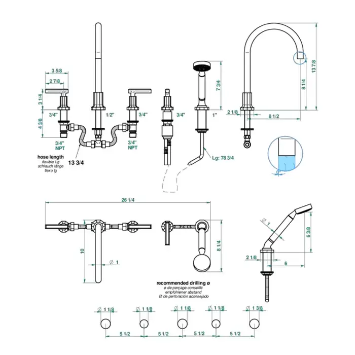 THG Les Ondes à manettes Смеситель для ванны, на 5 отв., с ручным душем, цвет: Matt nickel