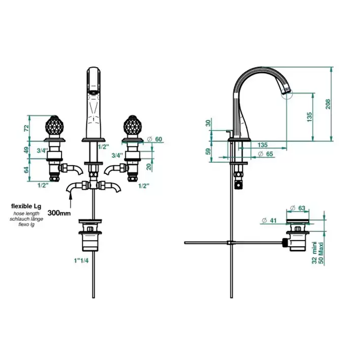 THG Mandarine Cristallia Diamant Смеситель для раковины на 3 отверстия, с донным клапаном, цвет: полированное золото
