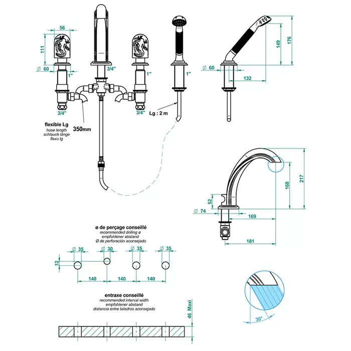 THG Naïade Cмеситель для ванны, 4 отв., цвет: золото/прозрачный хрусталь