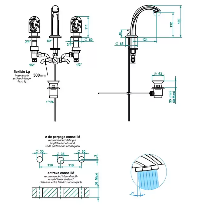 THG Naïade Смеситель для раковины, 3 отв., цвет: хром/прозрачный хрусталь